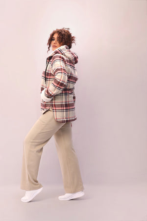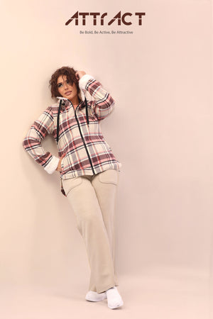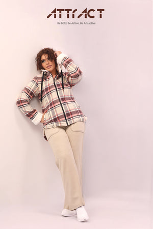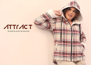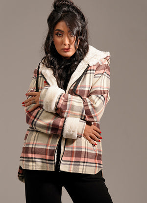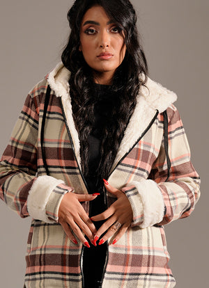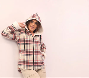 - A women cotton plaid jacket with fur lined, two pockets, zipper in the front .